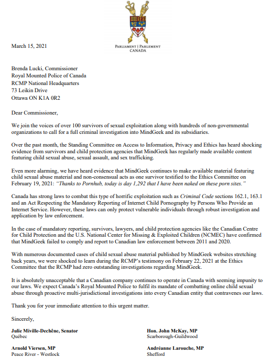 On March 25, the four APPG co-chairs and over 70 Senators and Members of Parliament from all eight political parties and groups sent a letter to RCMP Commissioner Brenda Lucki to support the 104 survivors and 525 NGOs calling for a full investigation into MindGeek and online exploitation. The RCMP Commissioner provided a comprehensive response to this letter on April 13, 2021 and indicated an investigation was under review.